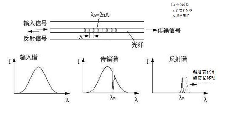 光栅也是普通单模光纤,作为光纤传感器。但是光栅要经过特殊的加工处理以改变其折射率,使其只对特定的波长进行反射。这样,一个宽谱的入射光经过光纤光栅后,只有满足波长匹配条件的极小谱宽的光信号被反射,其余波长的光信号透射进入下一个光纤光栅。当环境温度变化时,光纤光栅的反射光中心波长会随之改变(温度越高,波长偏移量越大)。通过对待测光栅的反射光中心波长进行数字化精确测量,即可获得该光栅位置的环境温度,如图1所示。